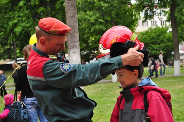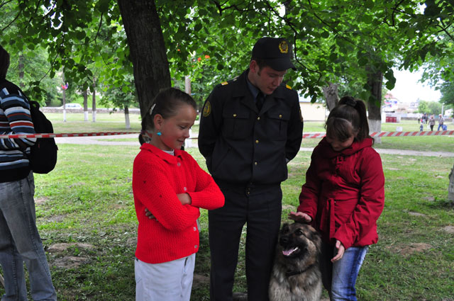 Работники МЧС выставили снаряжение спасателей, в котором детишки могли сфотографироваться. Также у ребят была возможность сделать фото на память со служебной овчаркой по кличке Альфа и подержать в руках оружие сотрудников милиции.