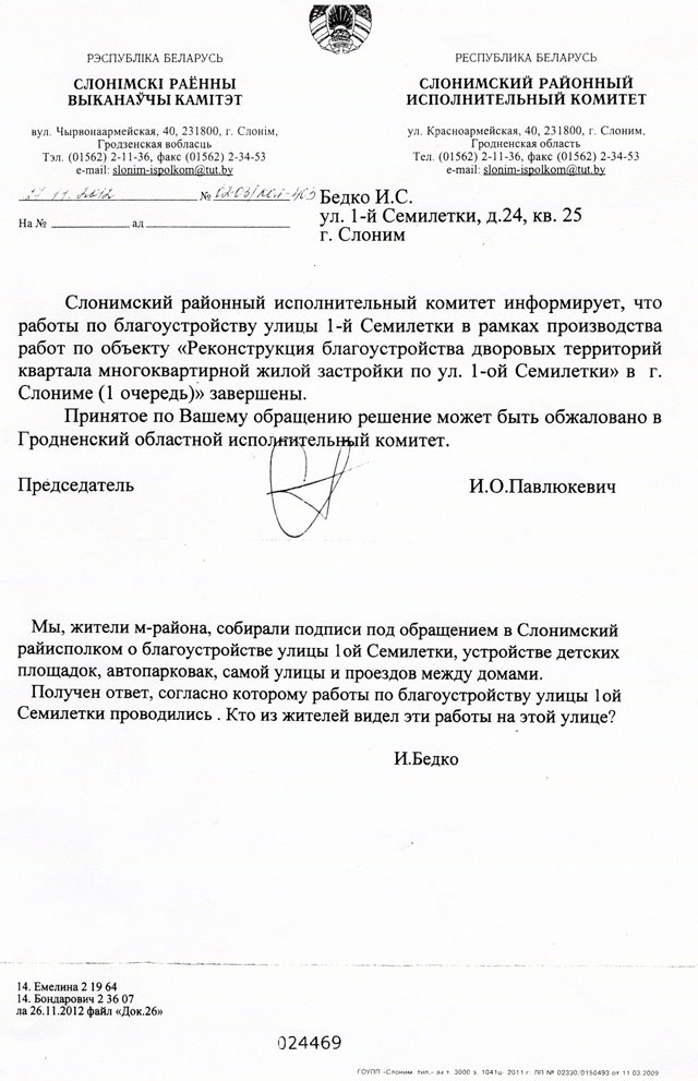 З пісьмовага адказу, атрыманага са Слонімскага райвыканкама ад 27.11.12 за № 02-03/кол-403, Іван Бядко даведаўся, што нібыта работы па добраўпарадкаванні вуліцы ўжо завершаны. У прыватнасці, там напісана: «Слонимский районный исполнительный комитет информирует, что работы по благоустройству улицы 1-й Семилетки в рамках производства работ по объекту «Реконструкция благоустройства дворовых территорий квартала многоквартирной жилой застройки по