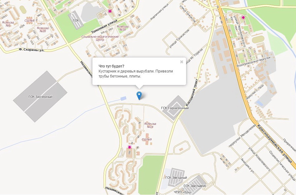 Зрители «Слоним ТВ» поинтересовались, что строится между гаражным кооперативом «Гарнизонный», универсамом «АЛМИ» и «Энкой», возле прудов-испарителей: там повырубали деревья, привезли плиты и трубы?