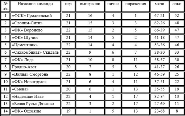 Турнирная таблица Чемпионата Гродненской области по футболу после 22-х туров: