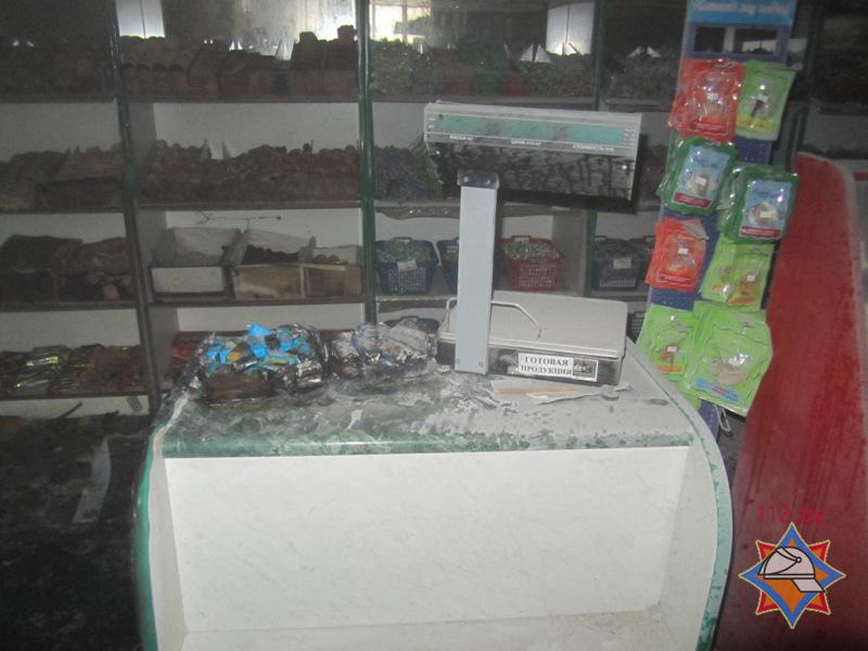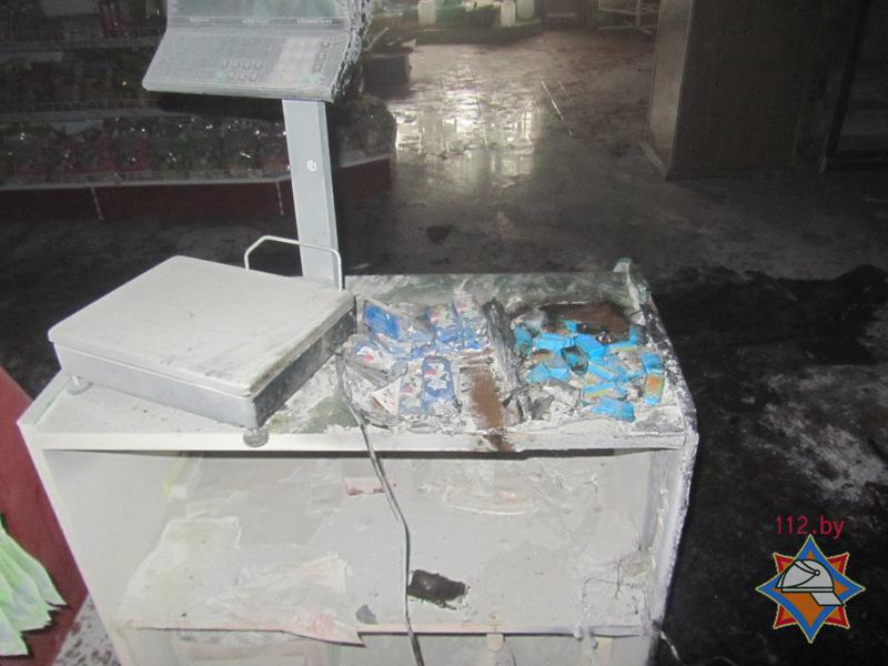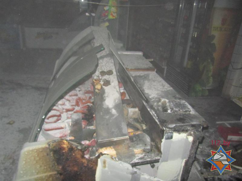 В результате пожара уничтожена столешница прилавка с находившимися на ней электронными весами, повреждены холодильная витрина, электронные весы, закопчены промышленные и продовольственные товары. Пострадавших людей нет.