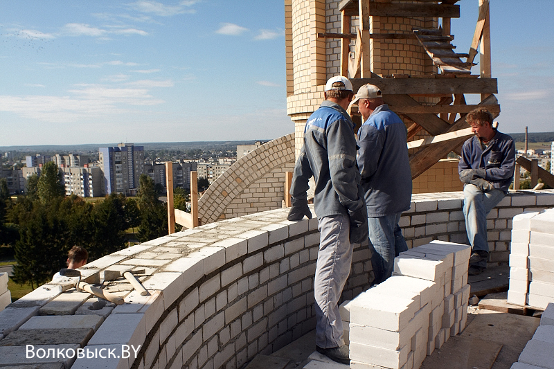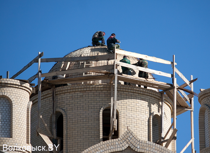 Бесстрашные строители заканчивают возведение центрального купола Благовещенского храма, который строится на ул.С.Панковой г.Волковыска. Учитывая, что на улице легкий мороз и весенний порывистый ветер, то только чтобы находиться там надо иметь крепкие нервы.