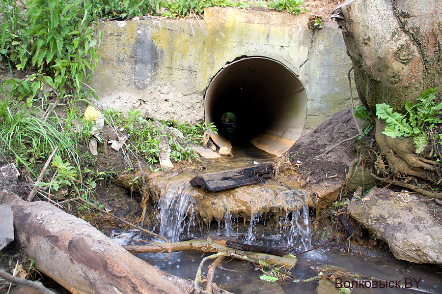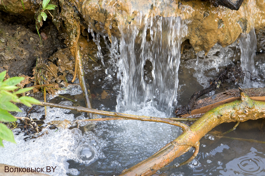 По факту сброса неустановленной жидкости в реку Россь на улице Октябрьской города Волковыска, районной инспекцией охраны природы и санитарной службой проводится проверка, но «караван идет», точнее плывет. Фото сделано 3 июня 2012 года в 20 часов 24 минуты в сухую погоду: