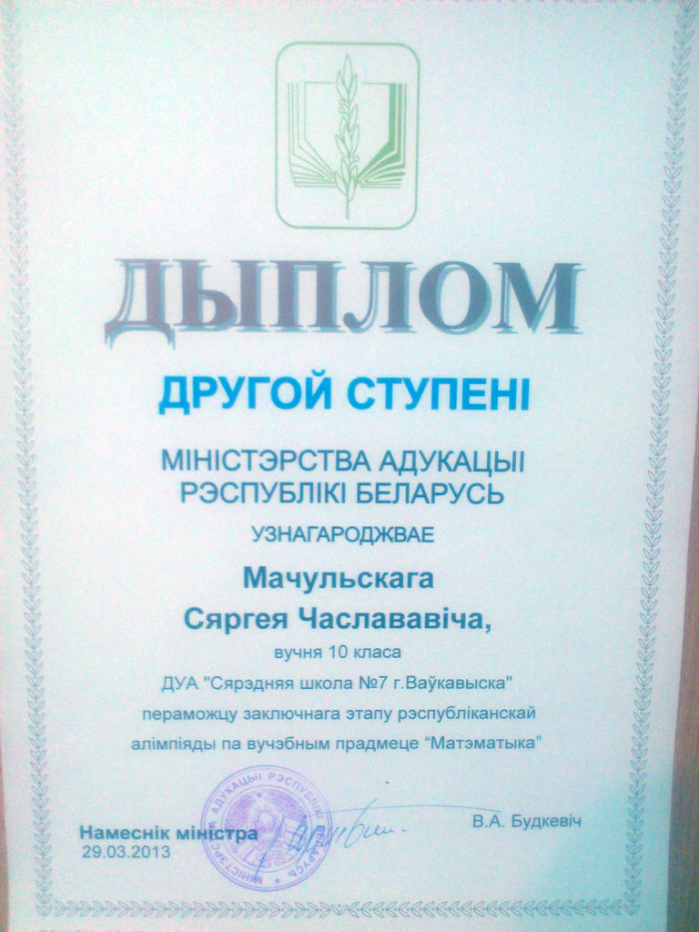 Выбор наш пал на царицу наук — математику, так как она является основой всех наук. В нашей копилке есть всего два диплома по математике, оба диплома принадлежат средней школе №7. Обладателем диплома второй степени по математике стал Сергей Мочульский, ученик 10 класса средней школы №7 города Волковыска. Посредством социальной сети Вконтакте он согласился ответить на наши вопросы.