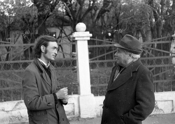 Один из старейших педагогов педучилища Сергей Александрович Бондаренко (справа) беседует с фотокором «районки» С.С.Господуро. Фото Б.Перовского.1980 год: