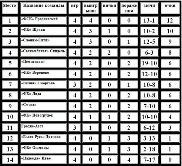 Турнирная таблица Чемпионата Гродненской области по футболу после четырех туров: