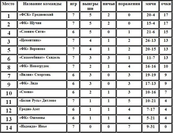 Турнирная таблица Чемпионата Гродненской области по футболу после семи туров: