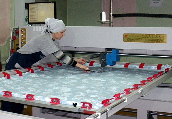 Кроме валенок, выпускаем из натуральной шерсти одеяла и подушки. Последние, кстати, недавно стали изготавливать следующим образом: оболочка натуральная шерстяная, а внутри синтетический упругий наполнитель. Одеяла шьем разных размеров — полуторные, двуспальные, евро, а с этого года и детские. Изделие прошивается различными узорами на специальной современной машине. В компьютер мастер устанавливает необходимые параметры и задает образец рисунка. Увеличили объемы производства. Одеяла из натуральной шерсти дают много тепла. Но для