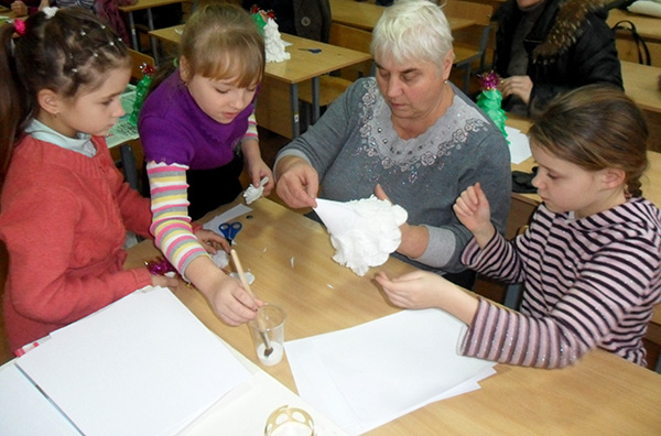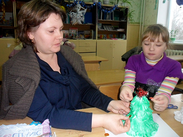 А ў гэты час у будынку самой школы праходзіла пасяджэнне бацькоўскага клуба «7-я» («Сям’я») . Кіраўнік Людміла Іванаўна Гавароўская прапанавала правесці яго ў форме майстар-класа «Майстэрня Дзеда Мароза». А ролю гэтага казачнага персанажа ўсклалі на кволыя плечы супертворчай асобы – Наталлі Уладзіміраўны Корзун, якая навучыла ўсіх прысутных хутка і якасна рабіць навагоднюю ёлку з … А вось і не здагадаецеся, з чаго! Такога ў нас яшчэ не было! З … ватных дыскаў! Наталлі Уладзіміраўне, нашаму Дзеду Марозу (хаця яна больш падобная на Снягурку), усеагульны давер — 100 %! Бо яна і сын Мікіта — неаднаразовыя дыпламанты раённых і абласных конкурсаў.