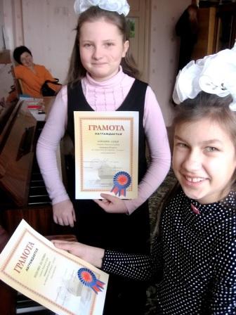 Семилетняя Катенька СМАГЛЮК (1 класс, преподаватель Татьяна Чистая) и восьмилетняя Анечка НОВИКОВА (1 класс, преподаватель Маргарита Коршунова) в Марьиной Горке впервые в жизни вышли на конкурсную сцену. И как приятно было им и их преподавателям, когда обеих девочек отметили наградами! Катя получила поощрительную грамоту в номинации «Дебют», а Аня вообще заняла первое место в младшей группе!
