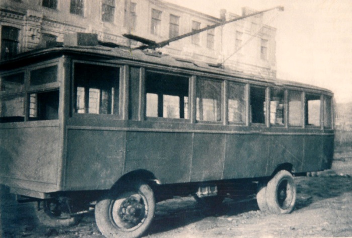 Пассажирский опытный троллейбус, собранный на базе старого автобуса, на испытательной линии в г. Ростове, 1933 год. Источник: книга Г. Беленького, Н. Редькова, И. Политики "Троллейбус родом из Ростова"