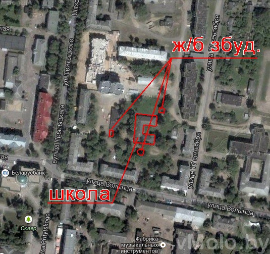 Из шести объектов точно определить местонахождение можно только одного — СШ № 1 — недалеко от Площади Свободы на ул.Я.Купалы (ссылка на историю СШ № 1). Любой объект из оставшихся пяти может быть нынешней школой № 4, но заметьте, из этих пяти целых три расположены в переделанных под их потребности зданиях . Неизвестно, что вообще могло скрываться за термином » приспособленный бывший жилой дом» — возможно и бывшая окружная полицейская комендатура?