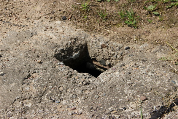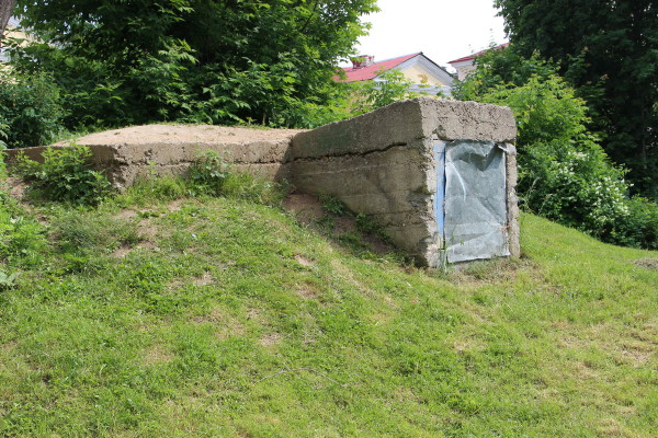 Бетонная постройка скрылась под слоем земли и травы, часть ее послужила фундаментом для более позднего сооружения: