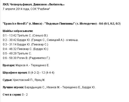 В первом периоде была заброшена лишь одна шайба. Это с передачи Сенько постарался Третьяк. Вторая треть игры уже чуть более богата была на шайбы. Дублем отметился Бурдук. Но а в заключительном периоде избиение «Epam Ice Needl’z» продолжилась. Минчане не смогли предпринять никаких ответных голевых действий, и в их ворота было отгружено еще три шайбы. Они на счету Пивовара, Третьяка и Рогача.