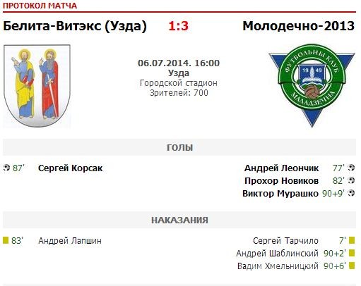 Основное время истекло. Шла уже девятая (!!!) добавленная минута. Нервы у всех были на пределе. Но хозяева не смогли воспользоваться таким огромным количеством добавленого времени и усталостью соперника. Зато это сделали молодечненцы. На исходе игры точный выстрел Виктора Мурашко достигает цели. Белита-Витэкс — Молодечно-2013 — 1:3.