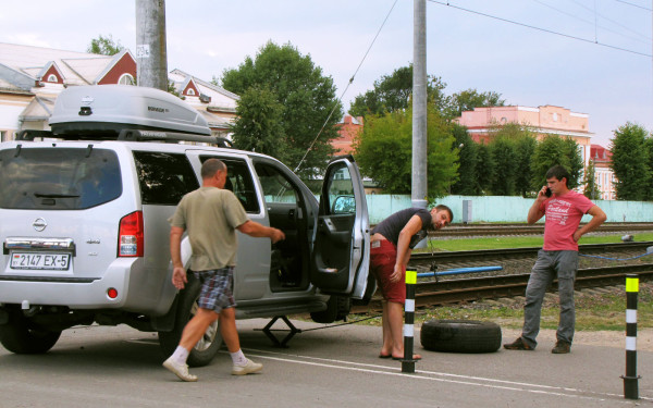 Водитель рассказал, что случилось, когда он вместе с пассажирами менял колесо еще на путях.