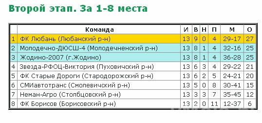 На это повлияли проигрыш в гостях «Молодечно-ДЮСШ-4» в игре со «Звездой-РФОЦ-Викторией» из Марьиной Горки и победа главного преследователя – футбольного клуба «Любань». Молодечненцы уступили со счетом 2:1. В их составе отличился Мойсеенок. Футболисты из Любани одолели дома борисовчан с результатом 3:0.