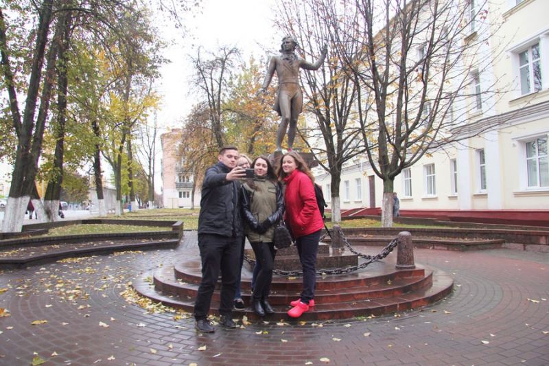 Сэлфі на памяць ля помніка Агінскаму робяць студэнты Беларускага дзяржаўнага універсітэта культуры і мастацтваў, якія прыехалі ў Маладзечна спецыяльна на міжнародную канферэнцыю. Фота Аляксандра Манцэвіча.