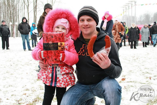 – Я делал это для дочки, – делится Павел и показывает рукой на малышку, которая держит коробку шоколадных конфет. Кроме этого, он получил еще и кольцо колбасы. – Масленица мне нравится. Весело.