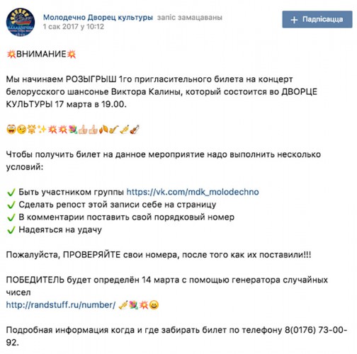 В среду руководство Дворца культуры решило разыграть пригласительный билет на концерт белорусского певца Виктора Калины. Выступать в городе он собирается 17 марта. Молодечненцам сама идея концерта, мягко говоря, не сильно понравилась.