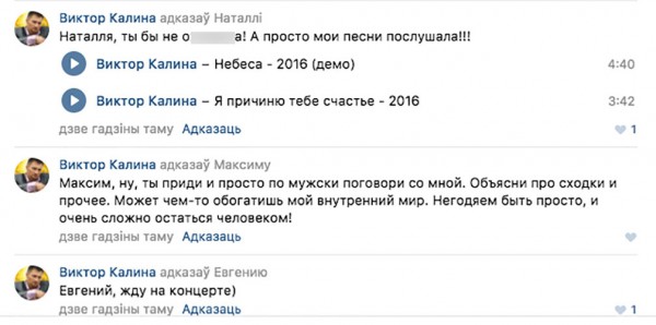 На официальной странице Дворца культуры в соцсетях местные жители возмутились приглашением певца в их город. Неожиданно в обсуждение противников его выступления ворвался сам Калина и высказал свое мнение, сообщает onliner.by.