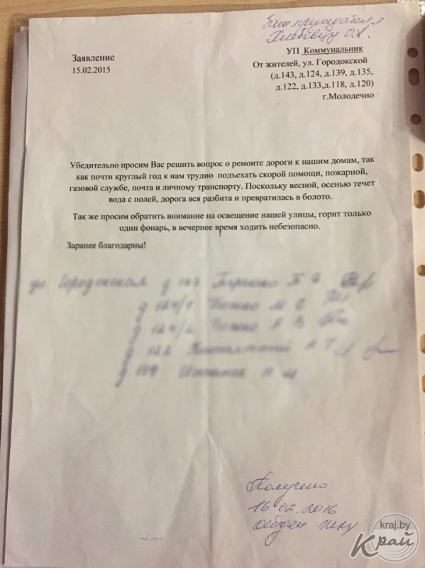 В феврале и марте этого года жители домов 118-143 по улице Городокской отправили два заявления в Молодечненский райисполком с просьбой отремонтировать дорогу. Они утверждают, что почти круглый год к их домам по этой дороге не могут проехать скорая помощь, пожарные, газовая служба, почта, да и личный транспорт.