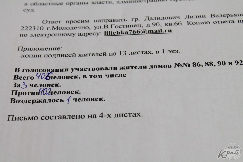 26 апреля жители квартала встречались с депутатом Палаты представителей Людмилой Кананович, которой передали коллективное письмо с собранными подписями. Копии письма они также направили председателю Молодечненского райисполкома Александру Яхновцу, начальнику отдела архитектуры и строительства Светлане Хрусталёвой и прокурору Молодечненского района Владимиру Дубовскому.