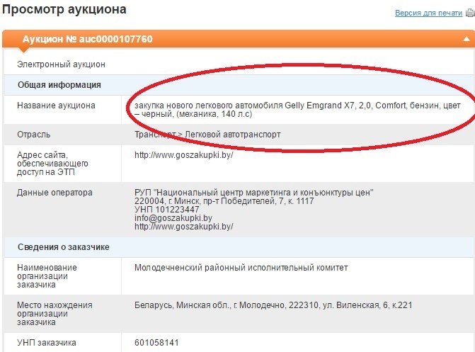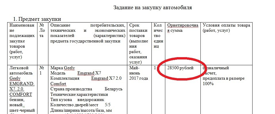 Согласно подробному описанию автомобиля, Молодечненский райисполком собирается купить черный внедорожник белорусского производства Geely Emgrand X7 в комплектации Comfort с бензиновым двигателем объемом 2.0.
