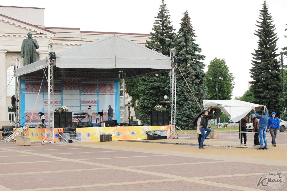 Монтировать сцену на Центральной площади начали еще 1 июня. А сегодня окончательно установили и накрыли брезентовым навесом. Звукооператоры проводят саундчек, так что музыка слышна далеко за пределами центра города.