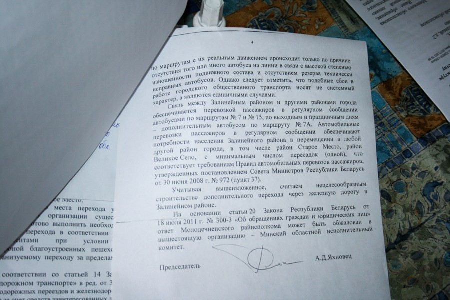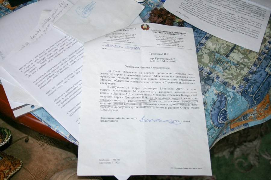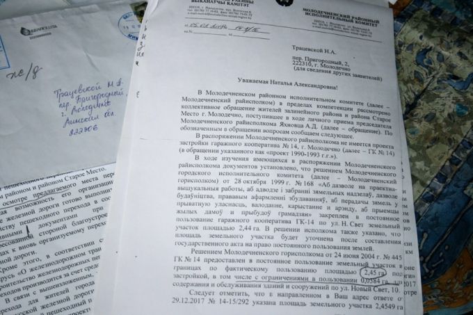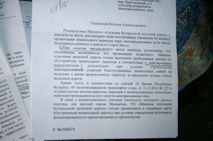 На это незамедлительно отреагировал райисполком – новым письмом в адрес Натальи Александровны. Его содержание уже не имело ничего общего с предыдущим. Ссылаясь на президентскую Директиву №1, чиновники сообщили, что калитка заварена с целью предотвращения несчастных случаев при несанкционированном переходе железнодорожного пути и для устранения условий, которые способствуют кражам имущества членов гаражного кооператива №14. А калитка и въездные ворота предназначены для обслуживания гаражных боксов и территории, прилегающей к кооперативу.