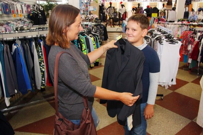 Молодечненка Татьяна выбирает сыну Дмитрию костюм. Он в этом году идет в пятый класс. Мама решила, что синий лучше, чем черный.