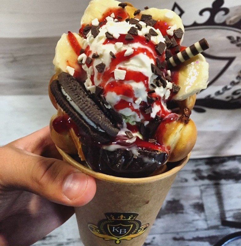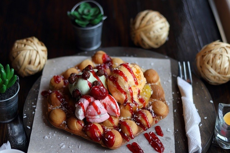 Подсмотренный в Гонконге формат уличной еды хорошо прижился и у нас в городе. В «Королевских вафлях» рецептуру доработали и разнообразили наполнителями. Фишка мини-кафе – крупнопузырящиеся вафли с начинкой, которая есть как в скрученной в трубочку вафле, так и в самих пузырьках.