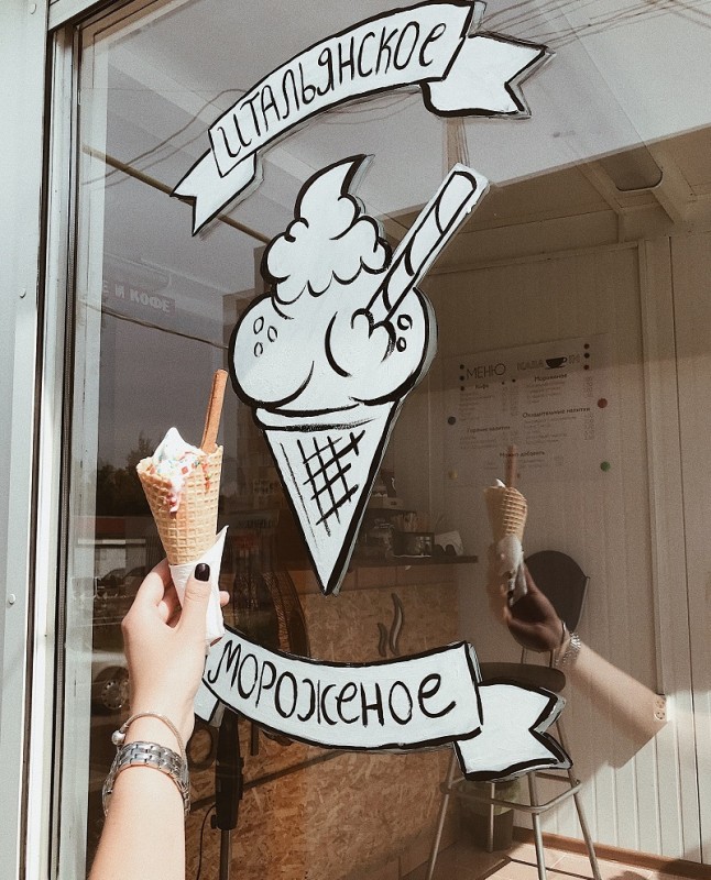 Кофе и мороженое можно взять на вынос, а при желании – насладиться напитками и десертом на летней террасе или за столиками внутри кафе.
