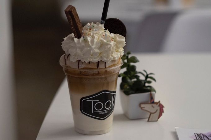 TOOK – это не просто кофейня. Заведение поддерживает направление «антикафе» и создает свою атмосферу. В просторном зале студенты за чашкой кофе готовятся к экзаменам, родители с детьми играют в «Уно», «Крокодила», «Крестики-нолики», «Домино», которые предоставляет кафе, читают расставленные на полках журналы.
