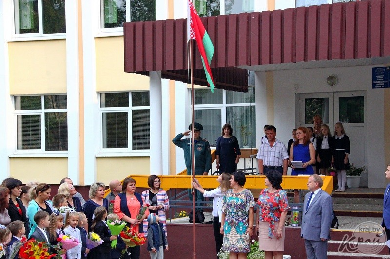 Торжественная линейка, посвященная началу учебного года, началась в 9.00 с приветственного слова ведущих и поднятия флага Республики Беларусь под гимн страны