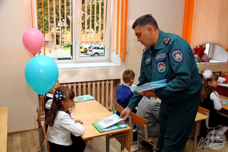 Главный специалист инспекции надзора и профилактики Молодечненского ГРОЧС Андрей Койко вручил первоклассникам подарки и напомнил о правилах пожарной безопасности