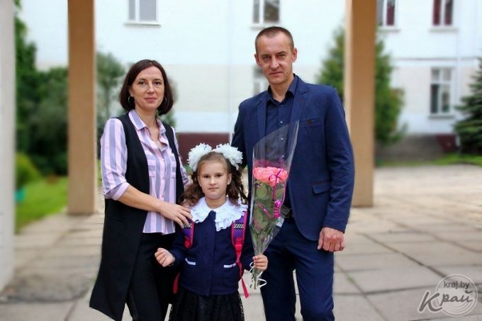 Ника Хозянина идет в 1 «А» класс. На линейку ее привели папа Юрий и мама Валентина. По признанию мамы, СШ №4 выбрали потому, что слышали очень много хороших отзывов о ней от знакомых. Сами живут в другом районе города, но решили отдать ребенка именно сюда. Ника подготовила стихотворение, которое рассказывала вместе с другими первоклассниками на линейке.