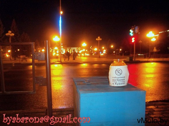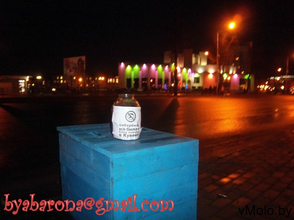 Группа молодых людей в городе Молодечно, называющих себя «Оборона», провели акцию, с незамысловатым названием «Соберемся на билет..!». В рамках мероприятия в центре города было установлено несколько трехлитровых банок с надписью «Соберемся на билет Сане лысому в Кувейт». Чудо-сосуды простояли не долго, но за эти несколько часов успели собрать немного мелочи. Горожане по достоинству оценили юмор молодых людей.