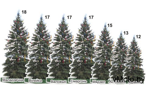 Согласно рейтингу, Молодечненская новогодняя елка с высотой в 18 метров занимает первое место по региону среди елок. Но нашу елку могли обойти Воложинцы, у которых изначально елка была высотой 20 метров и живая, в отличии от сборных конструкций Молодечно (около 30 елок по 2-5 метров) и Сморгони (около 200 метровых елочек общей высотой 17 метров), но 3 метра Воложинской елки пришлось отрезать, т.к. она не подходила по диаметру к подставке. Самая маленькая елка в Ошмянах, всего 12 метров.В Вилейке так же установлена 17-метровая ель. В Мяделе — 15 метров, и в Островце — 13.