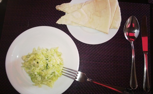 Я заказал салат «Белоснежка», лаваш, «Картофельный смажень», черный чай и творожную запеканку с джемом. Чай попросил принести немного позже. Салат и лаваш мне подали уже через 5-7 минут.