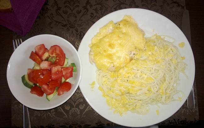 Заняв место за столиком я принялся изучать обеденное меню. Выбор у меня был небольшой, точнее сказать, его совсем не было. В меню был представлен только один салат и суп, а из горячих блюд лишь макароны и курица. В еде я не привередлив, но отсутствие выбора в меню считаю значительным минусом. Заказал себе овощной салат, макароны, куриное филе в сыре и чай.