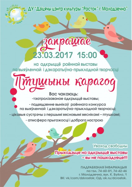 Дзіцячы Цэнтр культуры "Расток" у Маладзечне запрашае на адкрыццё выставы "Птушыны карагод"