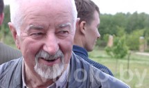 Хотите узнать больше? На фото: Рыгор Бородулин в Дудутках, 2001 год. Кузнец из Долгиново Валерий Пиразьев только что выковал народному поэту на счастье настоящую подкову.