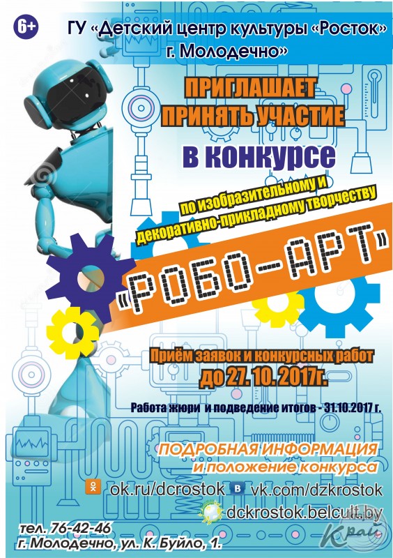 Хотите узнать больше? В Молодечно проходит творческий конкурс «Робо-Арт». Афиша предоставлена порталу kraj.by центром «Росток» Детский центр культуры «Росток» принимает на