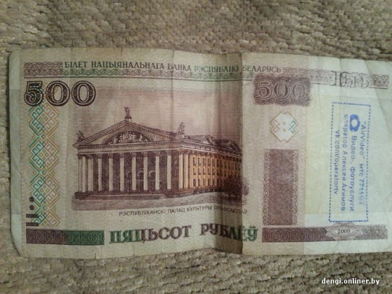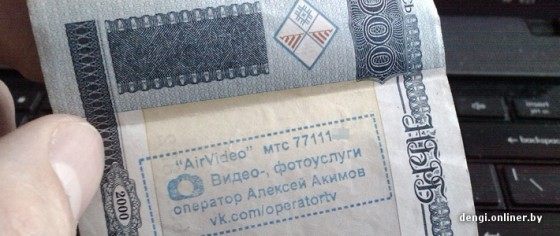 «На днях получил сдачу в магазине, как обычно, не особенно всматривался в купюры, — написал наш (сайта dengi.onliner.by — Прим.ред.) читатель Сергей. — Уже дома обратил внимание на одну, номиналом в 1000 рублей, на которой была конкретным образом размещена реклама фото- и видеоуслуг в виде печати с указанием номера телефона и группы „ВКонтакте“. Идея конечно, очень хороша, но мне кажется, это уже слишком. И, по-моему, закон будет против такого. Фото прилагаю».