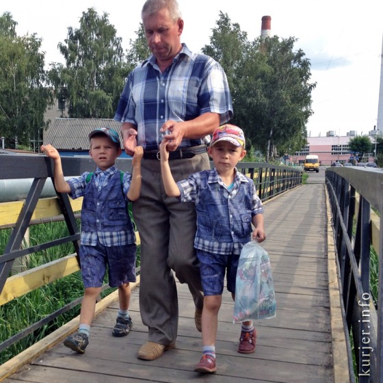 На мосту возле Слуцкой гимназии №1. У одного малыша кепка с Молнией МакКуин, у другого — с Кунг-фу Пандой.