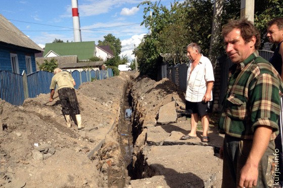 Неподалёку, на переулке возле фабрики «Слуцкие пояса» была вырыта траншея, где, собственно и шло подключение. Скоро этот переулок будут асфальтировать и другого шанса подключить частные дома к центральному водоснабжению практически не будет. Поэтому это было важно сделать именно в этот день.