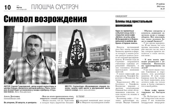 «Сюда предлагались варианты. Например, трёхметровые женские фигуры. Но я подумал: как это фигура ткача 2,2 метра у фабрики и рядом – в центре сквера – женская фигура три метра. Тогда я и предложил своё видение, свой вариант. Так получилось, что художественный совет его одобрил». Интервью с Сергеем Гумилевским , автором скульптур «Возрождение Слуцкого пояса» и «Ткач» читайте в печатном номере газеты «Кур'ер» (покупайте с 29 августа).