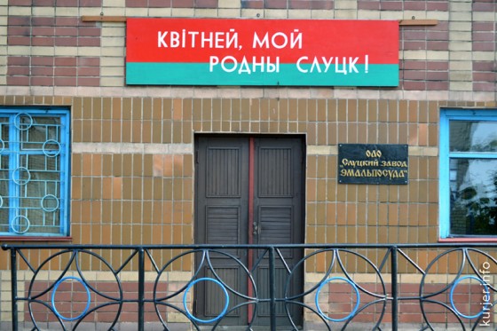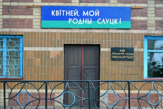Вот, к примеру, вывеска на административном здании Слуцкого завода «Эмальпосуда». Всё оформлено в соответствии с нынешними зелёно-красными тенденциями.