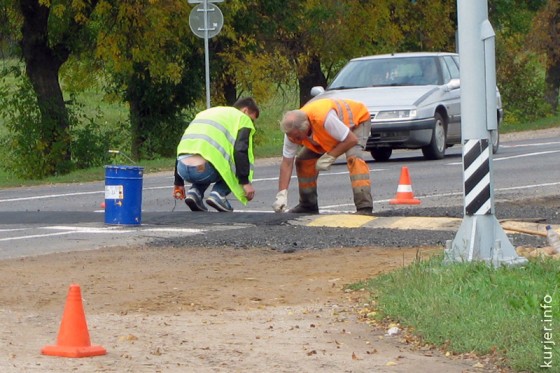 Понедельник, 16 сентября. Дорожные рабочие корректруют искусственную неровность. «Лежачий полицейский» с момента установки на прошлой неделе был обозначен и упреждающими дорожными знаками, и соответствующей разметкой. Фото: Инна Шилович